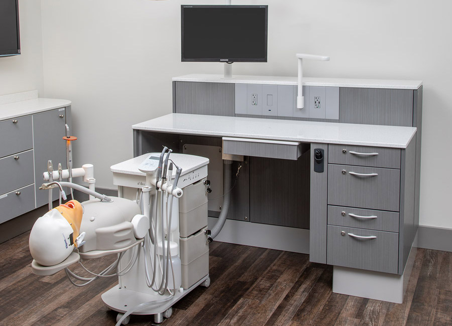 The A-dec Simulator Pro is a dental simulation system for preclinical training that helps students develop proper ergonomics, positioning, and clinical skills in a realistic environment. Designed for dental schools and teaching laboratories, it integrates essential dental instruments, supports multiple working positions, and is available in stationary or mobile configurations to suit different learning spaces.
